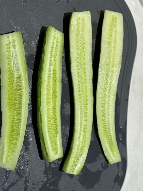 - 오이 손질: 깨끗이 씻은 오이를 양쪽끝은 잘라버리고 길게 반으로 자른 후, 도마에 두고 칼로 가볍게 탕탕 두드려 부숴줍니다. 이렇게 하면 양념이 잘 배고 식감도 더 아삭해져요. 저는 오이 껍질도 가볍게 벗겨 주었어요.